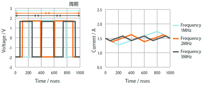 インダクタンスや周波数が変動した場合、電圧の大きさは変わりませんが、リップル電流の大きさには影響を与えます。インダクタンスが大きくなると電流変化が抑えられるため、リップル電流は小さくなります(図2-5-7)。また、周波数が高くなると1サイクルの時間が短くなるため、リップル電流は小さくなります(図2-5-8)。