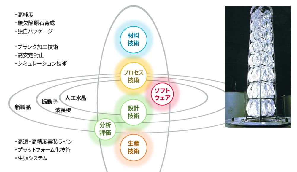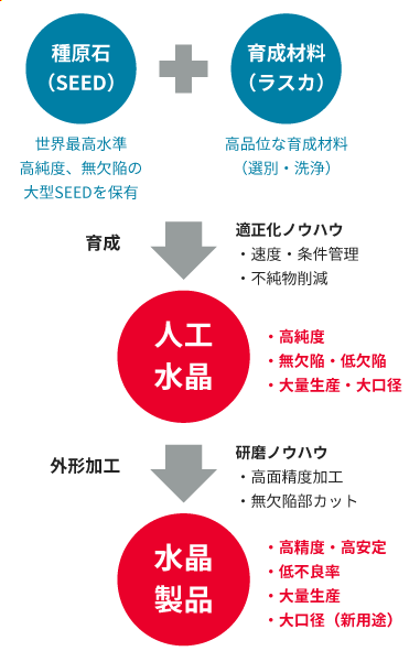 つまり、高品位、高精度の水晶製品には高品質の人工水晶内製化が不可欠です。