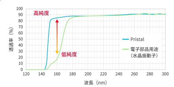波長が深紫外域(200nm以下)になると、不純物の吸収が問題となります。数値は一般的な人工水晶と弊社Pristalとの金属不純物濃度の比較です。特にアルミニウムの吸収によって透過性能に大きく差が出てきます。