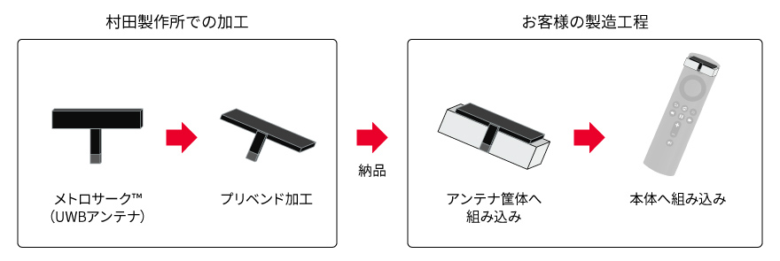 リモコンへのUWBアンテナ採用事例では、狭小スペースへの組み込みが困難であるというお悩みに対して、メトロサーク™をプリベンドした状態で納品しています。お客様の製品専用プリベンド加工するため、ワンタッチでの組み込みが可能。組み込み時の作業性が大幅に向上したとのお声をいただいております。