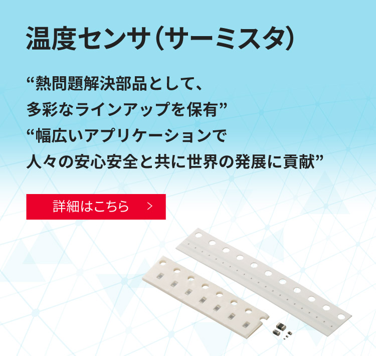 温度の変化により、抵抗値が変化する電子部品で、発熱体、感温素子の働きを応用し、温度センサ、回路保護、温度補償など様々な用途で活用できます。 高精度で熱応答に優れた素子を用い、形状や用途に応じ、多様なラインアップを提供しています。