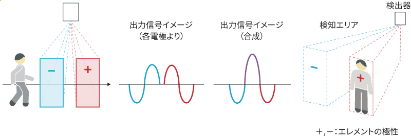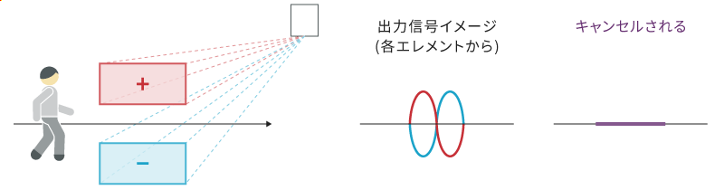 2つの電極を順次横切る方向(水平)からの入力に感度を持つため、壁付けセット(水平方向の動きの人体検知)での使用に適しています。