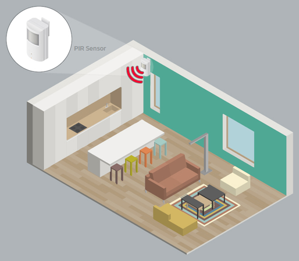 屋内に焦電型赤外線センサを内蔵したセキュリティ機器を設置して、外出時にシステムをONにすると屋内の人(熱)の動きを検知して、警備会社への通報や個人の携帯に通知します。 IPカメラを内蔵している場合は、人(熱)の検知によりカメラを起動させ録画します。 広い指向性のレンズ使用により、広範囲を検知することが可能です。 最近では家のシステムや家電を制御するスマートホーム向けにサーモスタットに取りつけ、セキュリティと家電のWakeUpを兼ねるケースも出てきています。