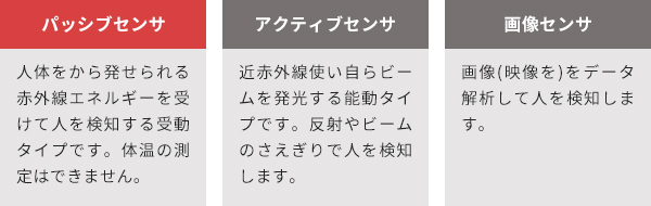 人体検知できるセンサが、それぞれどのような原理や検知機能を用いているか比較しました。