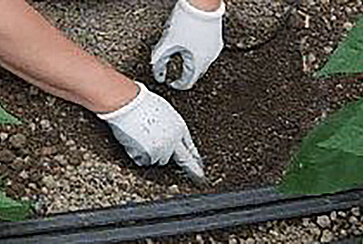 灌水チューブ位置から、土壌中の水分率、EC値は3次元的な分布を持っています。 作物の種類や灌水チューブの位置と苗の位置など総合的に考えて最適なセンサ位置を決定する必要があります。