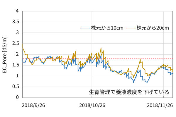 灌水チューブから1.8dS/mの濃度の養液を灌水しています。土壌中のEC_Poreを計測すると、その濃度が計測されていることが分かります。