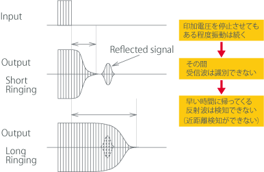 送受兼用タイプの超音波センサは1つのセンサが送信と受信の両方を行います。入力信号を止めても、センサの振動が止まるまでは受信波を受け取ることができません。この振動している時間を残響時間といい、残響時間が長いと近距離を検出することができません。※残響特性はセンサの固定方法にも影響されます。(基礎知識・使い方参照)