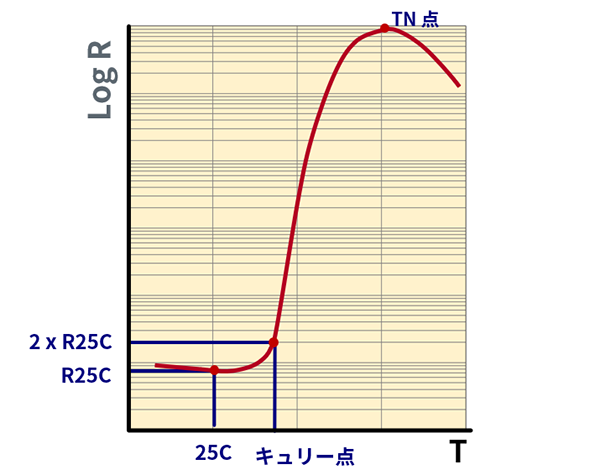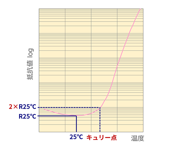 キュリー点(C.P.)は、25°Cにおける抵抗値の2倍の抵抗値となる温度と定義されています。 常温からキュリー点の間で、わずかに減少するか、ほぼ一定の抵抗値ですが、キュリー点を超えると対数的に抵抗値が増加します。