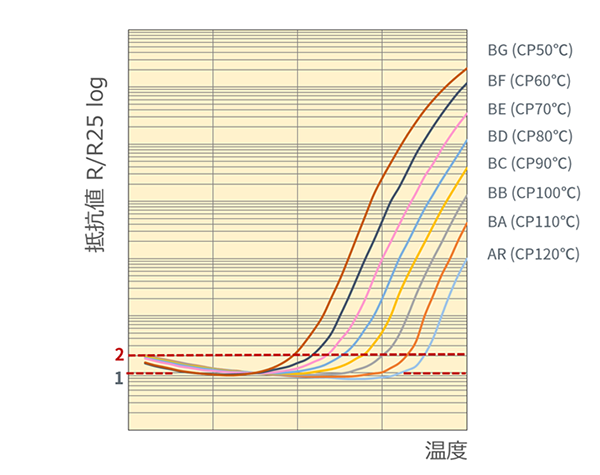 図2 : キュリー点の違うPTC抵抗値-温度特性