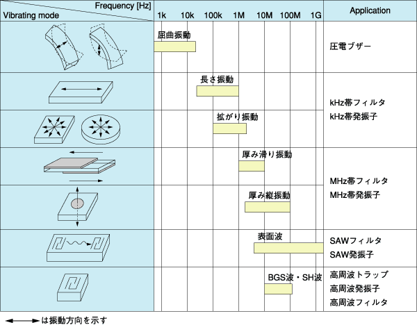 圧電素子は、圧電セラミックスの機械的共振を利用した発振子であり、その共振周波数によって対応できる振動モード (振動姿態) が異なります。この関係をまとめると下記表のようになります。