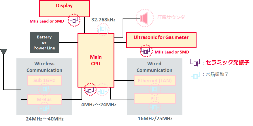 各種スマートメータ(電力・ガス・熱・水道)に搭載されるディスプレイや超音波式流量センサ、マイコンに「セラミック発振子」、有線や無線の通信用のICに「水晶振動子」、データ読み込みの確認音デバイス用に「圧電サウンダ」が使用されています。