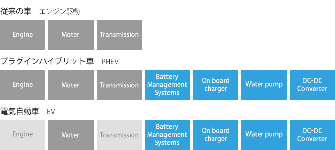 その中で電気自動車の普及により車両内で車載用バッテリ・マネージド・システム(BMS)やオンボード・チャージャ(OBC)、Water pump(WP)、DC-DCコンバータの需要が増加してます。