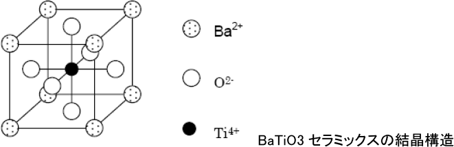 BaTiO3 は下図に示すようにペロブスカイト(perovskite)形の結晶構造を持ち、キュリー温度以上では立方晶系(cubic)で、Ba2+イオンは頂点に、O2-イオンは面心に、Ti4+イオンは体心の位置にあります。