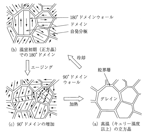 これをキュリー温度以下に冷却すると、キュリー温度近くで立方晶系から正方晶系へ相転移し、C 軸方向が約1%伸び、他の軸がわずかに縮んで自発分極および分域が生成します。同時に結晶粒は周りから歪みによるストレスを受けるようになります。