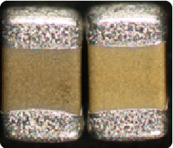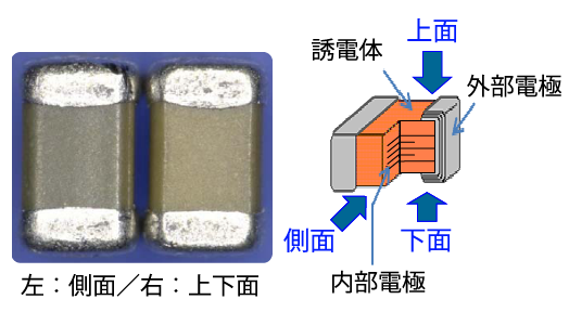 積層セラミックコンデンサのセラミック素子の色は、同じ製品でも内部電極の透け具合により、上下面と側面で色が違って見えることがあります。