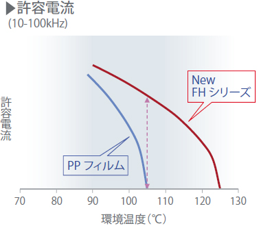 FHシリーズは高温・高周波の領域で、優れた許容リップル電流特性を有します。詳しくはお問い合わせください。