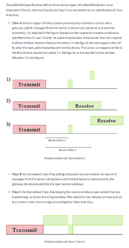 LoRaは双方向通信プロトコルです。アップリンク時間やダウンリンク時間は動作クラスによって異なります。 動作の異なるクラスのアップリンクとダウンリンクの詳細は、こちらのページ別ウィンドウで開くを参照してください。