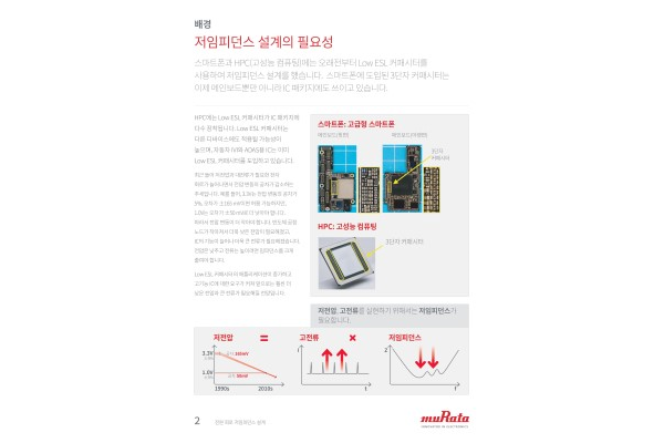 muRata 테크 페이퍼에서는 PDN 설계와 디커플링 커패시터 타입 및 레이아웃, 기판 설계를 이용하여 임피던스를 낮추는 방법을 소개하고 있습니다.