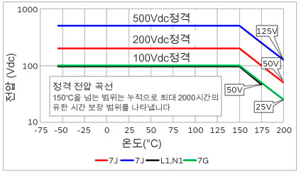 제품 온도가 150℃을 넘는 경우에는, 다음과 같이 정격 전압에 대하여 콘덴서에 인가되는 전압을 줄여서 사용해 주세요.