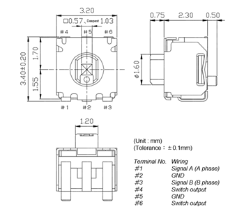 2 phase의 펄스 출력, 푸시 스위치 기능을 3.4✕ 3.2✕ 2.3mm(돌기부 제외)의 초소형 사이즈로 구현했습니다.