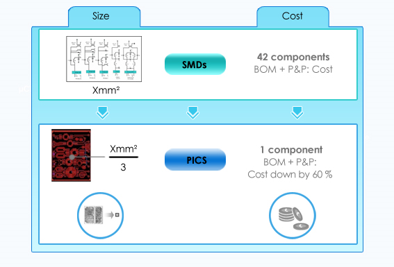 What is the impact on BOM of using PICS in a high volume application? Example of a PICS for GSM, Edge and 3 W-CDMA transceiver