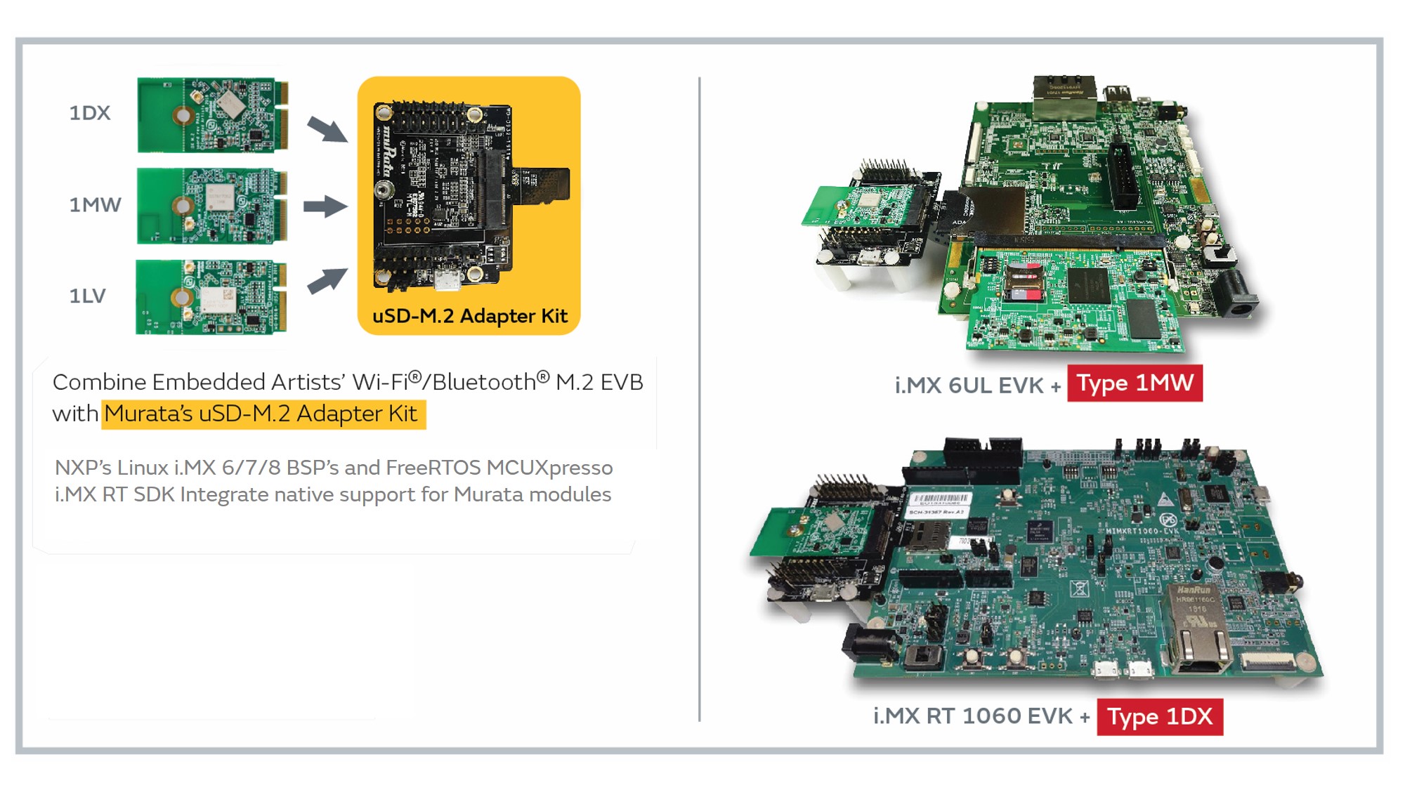 The Murata uSD-M.2 Adapter Kit connects to the uSD slot on the NXP i.MX Platforms, which provides power and WLAN-SDIO. The Murata Adapter Kit provides an M.2 connector, allowing application developers to connect the Embedded Artists Types 1DX, 1MW and 1LV M.2 EVBs, which provide IEEE 802.11 a/b/g/n/ac and BT/BLE connectivity.