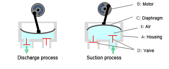 The diaphragm moves up and down by converting the rotation of a motor into the movement of the diaphragm. The volume of the pump housing in the center space repeatedly expands and contracts with this movement, and air is sucked in when it expands, and air is discharged when it contracts.