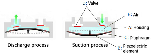 Air pumps include a motor-type pump, voice coil motor (electromagnetic)-type pump, and piezoelectric-type pump, etc. All the types use a valve to divide the suction and discharge, and generally repeat the suction and discharge of air through the reciprocating motion of a diaphragm by a drive source (motor / piezoelectric, etc.).