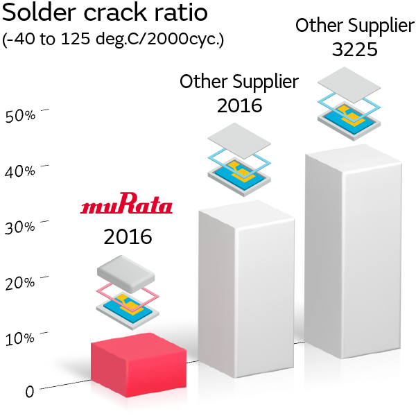 Soldering connection resistance is sought in applications including radars, ADAS ECUs, central ECUs, engine ECUs, TPMSs, and cameras with characteristics such as severe temperature changes, heat control difficulty, and a large number of laminated boards. Murata Manufacturing’s crystal units have a unique structure. This structure improves the average value of resistance to cracking that occurs during soldering (product life) by 20 points or more compared to other companies.