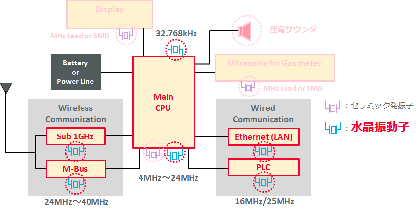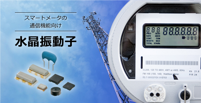 各種スマートメータ(電力・ガス・熱・水道)に搭載されるディスプレイや超音波式流量センサ、マイコンに「セラミック発振子」、有線や無線の通信用のICに「水晶振動子」、データ読み込みの確認音デバイス用に「圧電サウンダ」が使用されています。