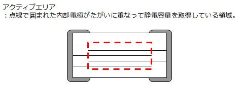 チップ積層セラミックコンデンサに機械的、熱的応力が加わることでクラックが発生し、そのクラックが内部電極のアクティブエリア(図1)に達した場合、その部分の内部電極間でリークを起こし、絶縁抵抗が低下(ショート)に至る可能性があります。