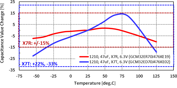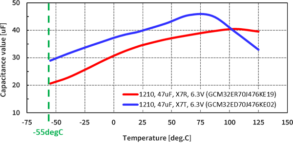另一方面,在实际使用条件下,在工作温度范围(-55至125℃)内进行比较可以发现,X7R和X7T在低温侧的电容变化率均变大。
